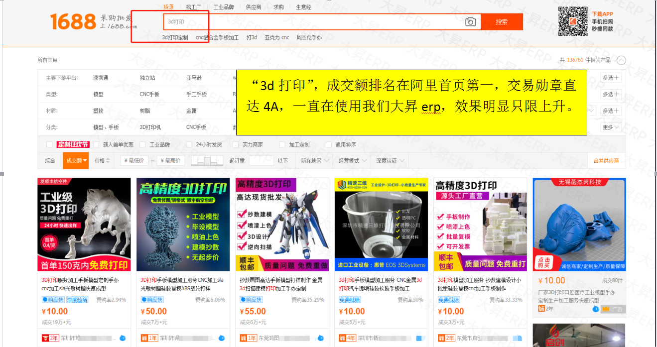 深圳市器材行业刘总使用大昇ERP ,店铺核心关键词3d打印,一直使用我们大昇erp,现在交易勋章达到4A,成交额排名第一,效果非常不错的