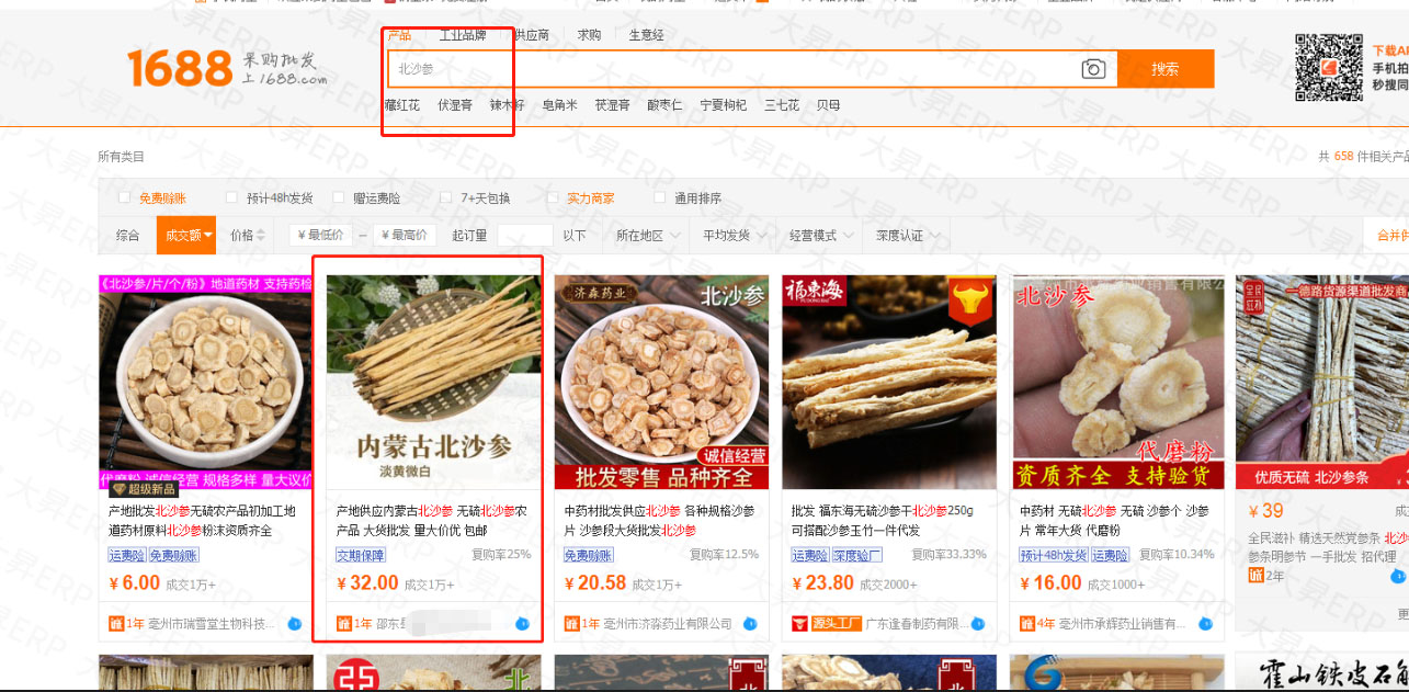 湖南省药材行业马总使用大昇ERP ,店铺核心关键词北沙参,综合排名在阿里首页第一页