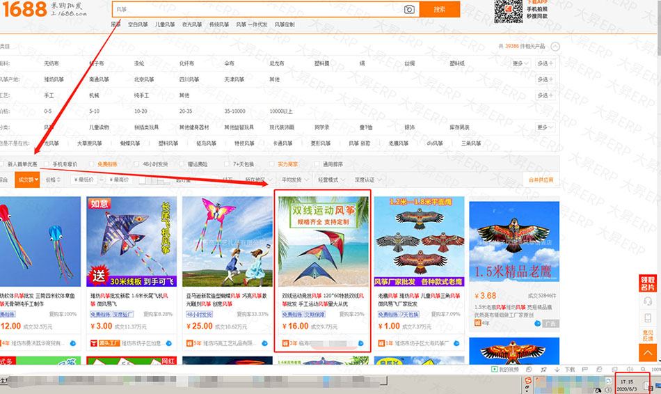 临海市办公文教行业郭总使用大昇ERP ,店铺核心关键词:风筝,成交额在阿里首页排名第四名,效果非常不错的,成交笔数真实可见