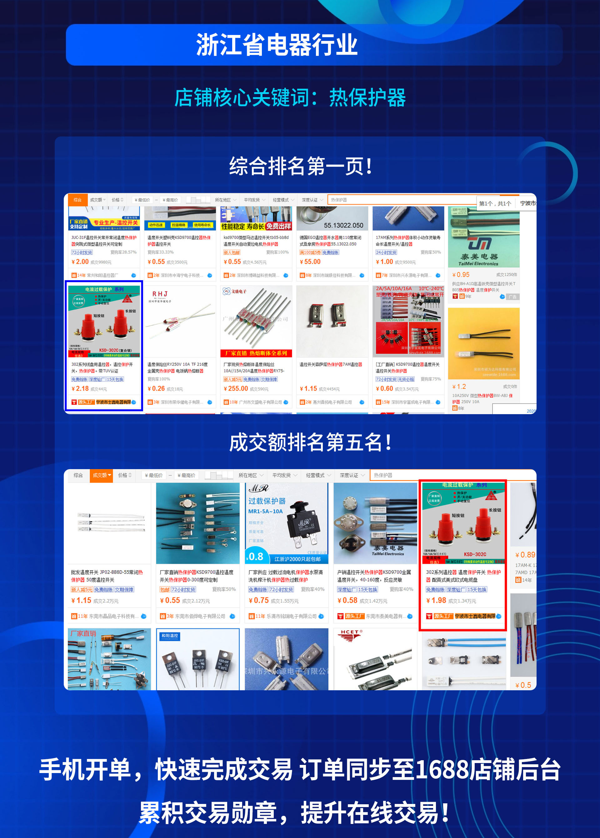 浙江电器行业曾总使用大昇ERP ,诚信通店铺核心关键词: 热保护品,综合排名在阿里首页第一页,成交额在阿里首页排名第五名,效果非常不错的