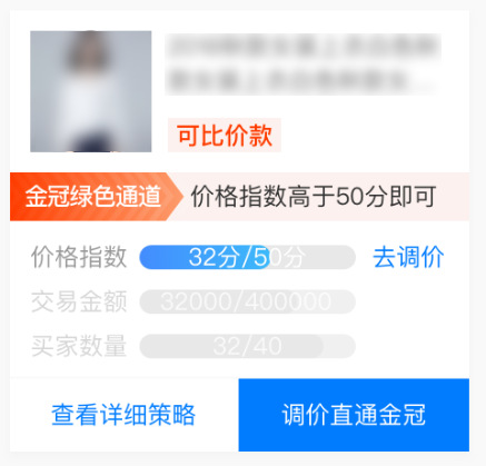 1、重点关注:"可比价款"标签的商品,通过调整商品价格指数高于50分(价格低于金冠基准价),即可升为金冠商品。