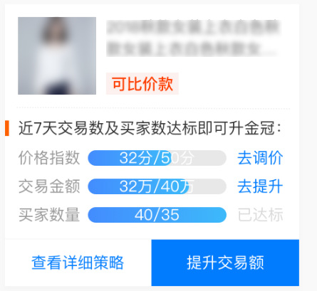 2、当可比价款,绿通到金冠商品,平台将给予10天奖励时间,你需要在10天内满足以下三个条件:价格指数保持>=50分、近7天交易额达标、买家数达标,你的商品就能维持在金冠品上。否则会降级为潜力商品。